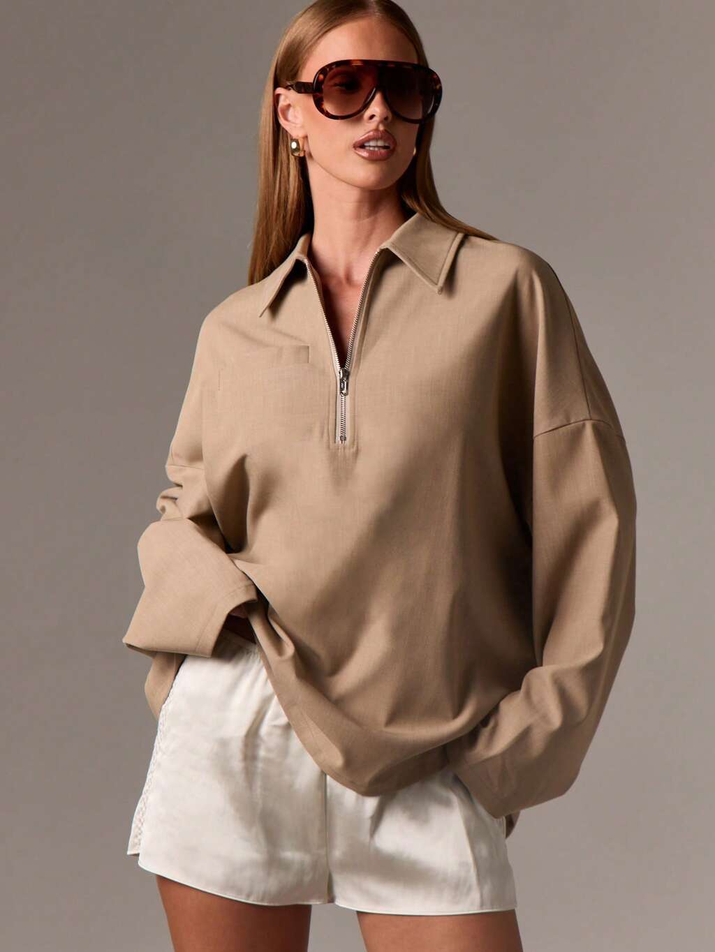 AiiRZ Kurtka oversize z kołnierzem zapinanym na zamek błyskawiczny, luźna, z długim rękawem, lekka, jesienno-wiosenna, minimalistyczna, wyrafinowana, w miejskim stylu, w stylu przejściowym, na pogodę