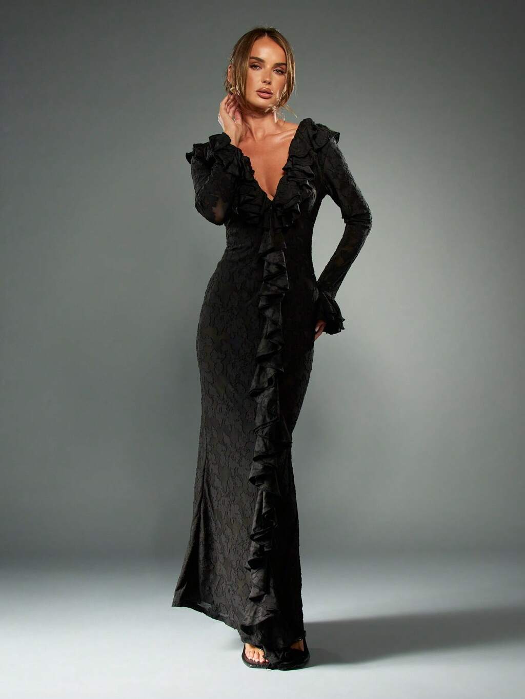 MISSGUIDED Sukienka maxi z rozkloszowanymi rękawami i dekoltem w serek oraz falbankami