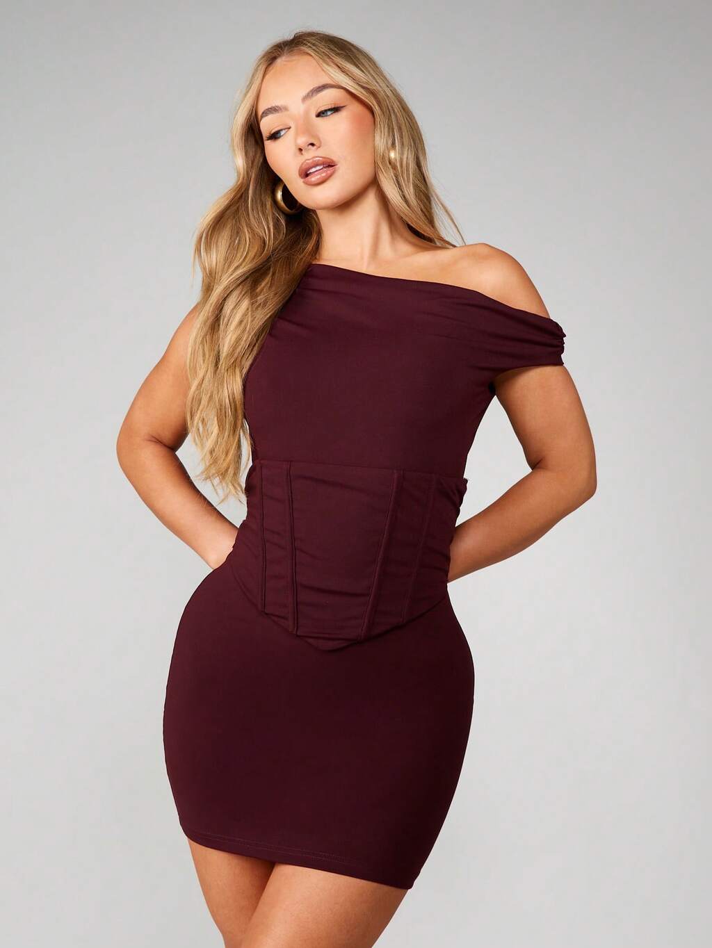SUMWON WOMEN Vestido Curto Bodycon de Malha com Ombros à Mostra, Detalhe de Cintura de Espartilho e Saia Franzida para Festas e Ocasiões à Noite