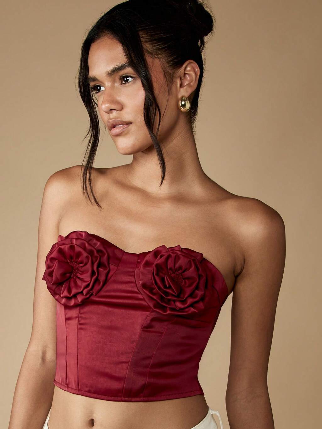 MISSGUIDED Top corset de cetim com detalhe de rosa e barbatanas franzidas para o Natal.