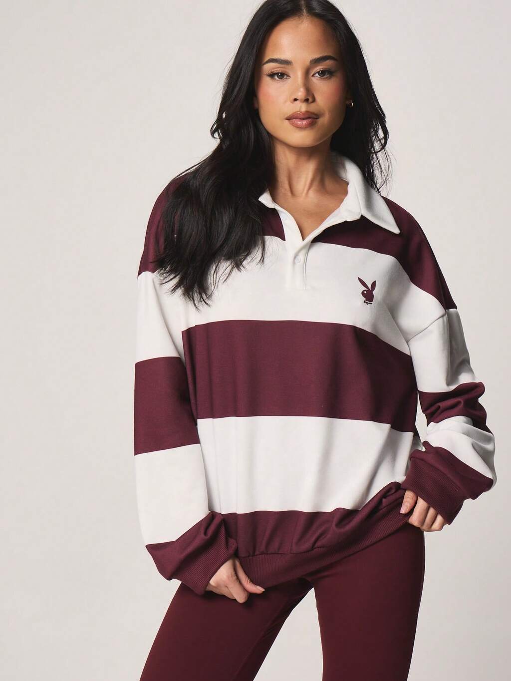 Missguided x Playboy Moletom cropped listrado oversized com zíper e capuz.