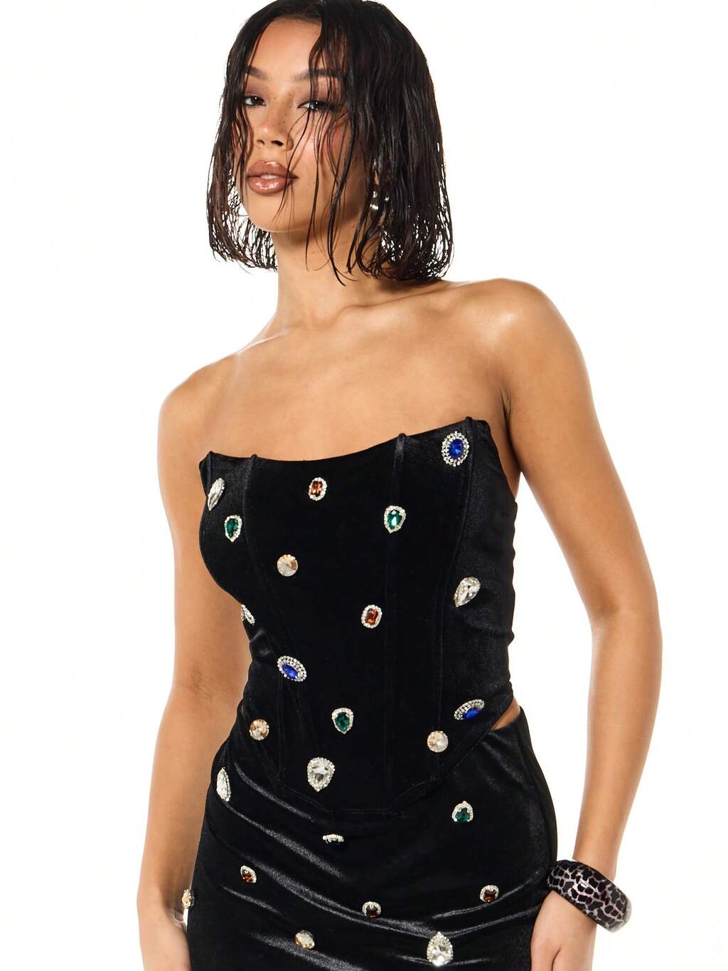SUMWON WOMEN Top Corselet Sem Alças de Veludo com Enfeites de Cristais Coloridos e Detalhes de Cadarço Nas Costas para Ocasiões à Noite