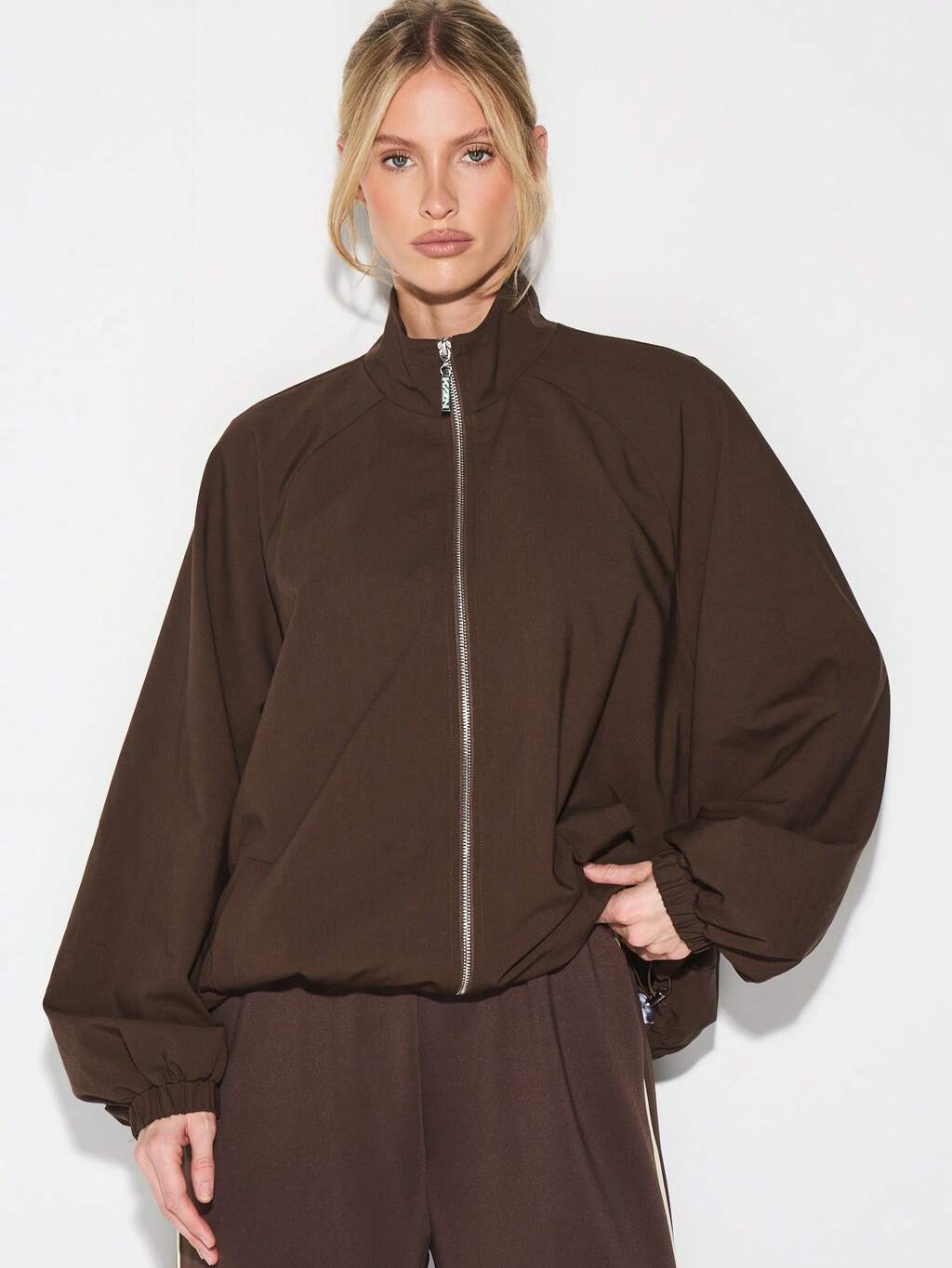 KIZN Jaqueta de Moletom Marrom Oversized com Zíper, Gola Elevada e Punhos Elásticos para Uso Casual no Outono e Inverno