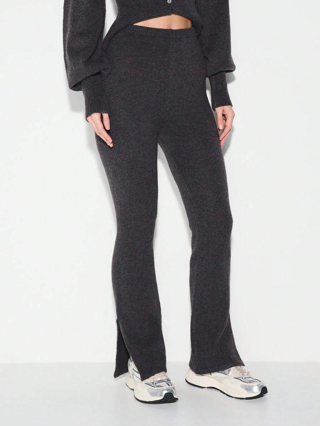 KIZN Calça Flare de Cintura Alta com Detalhe de Barra Dividida, Tricô Canelado, Confortável Stretch, Bottom de Loungewear para Outono e Inverno