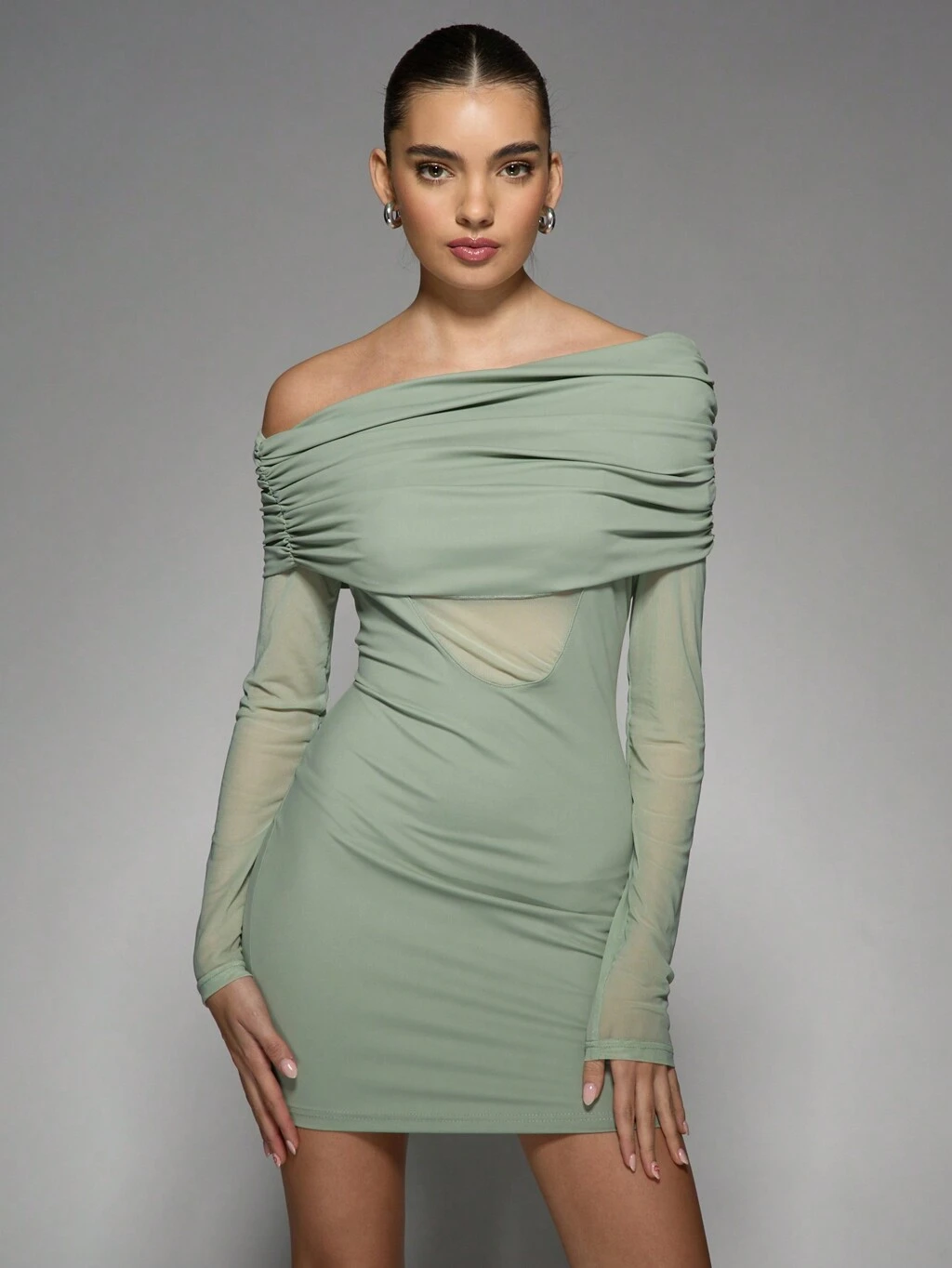 KIZN Vestido de Festa Mini Drapeado com Mangas Longas, Bandagem Bodycon para Festa à Noite, Casamento, Convidado, Ombro de Fora