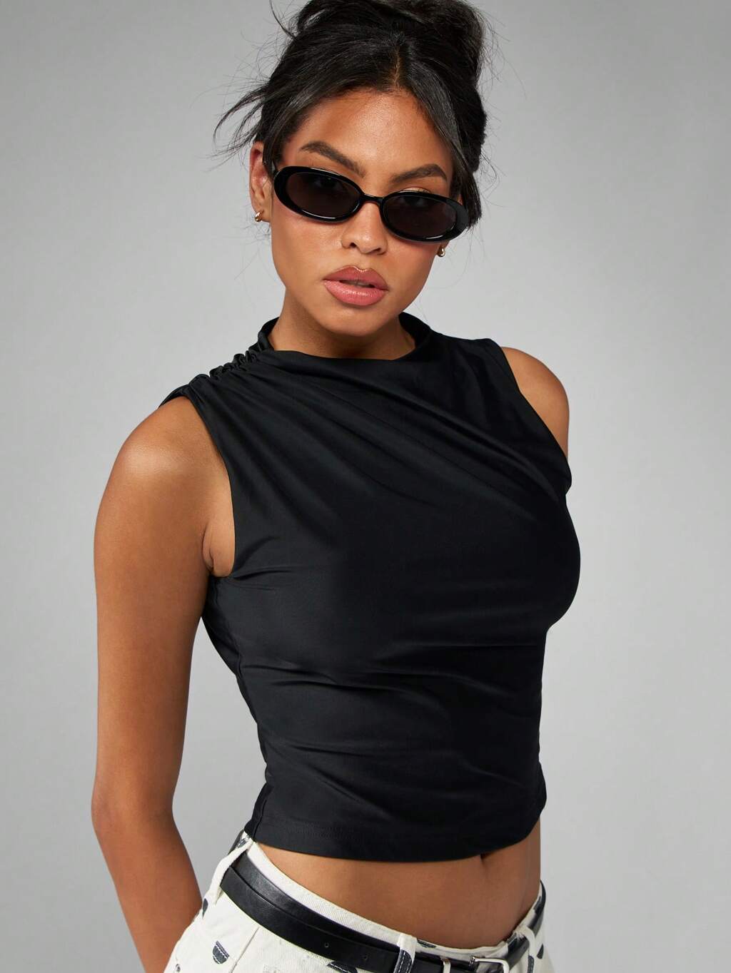 MISSGUIDED Top curto sem mangas com decote falso e design franzido