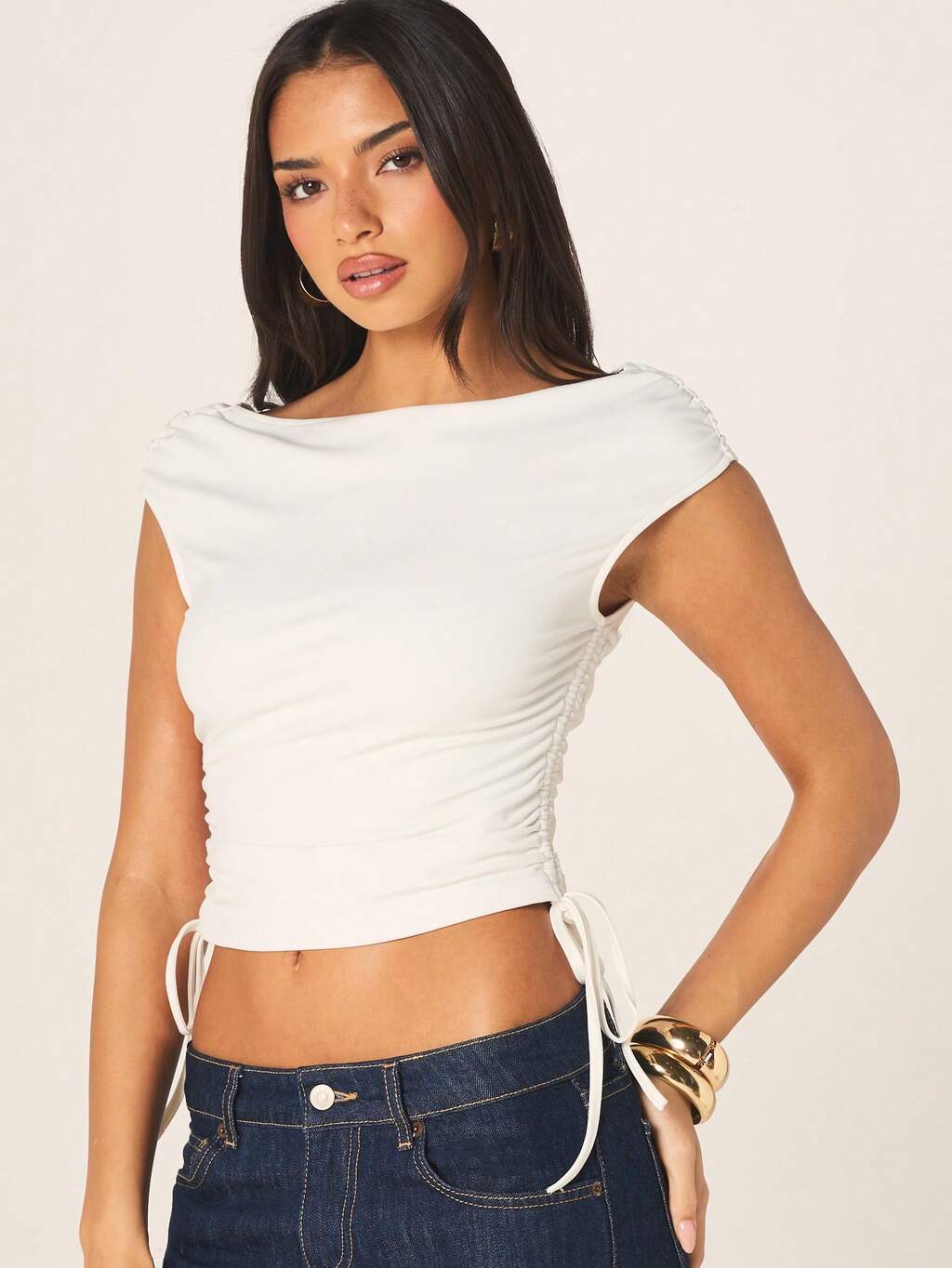 MISSGUIDED Blusa com decote canoa e amarração lateral franzida