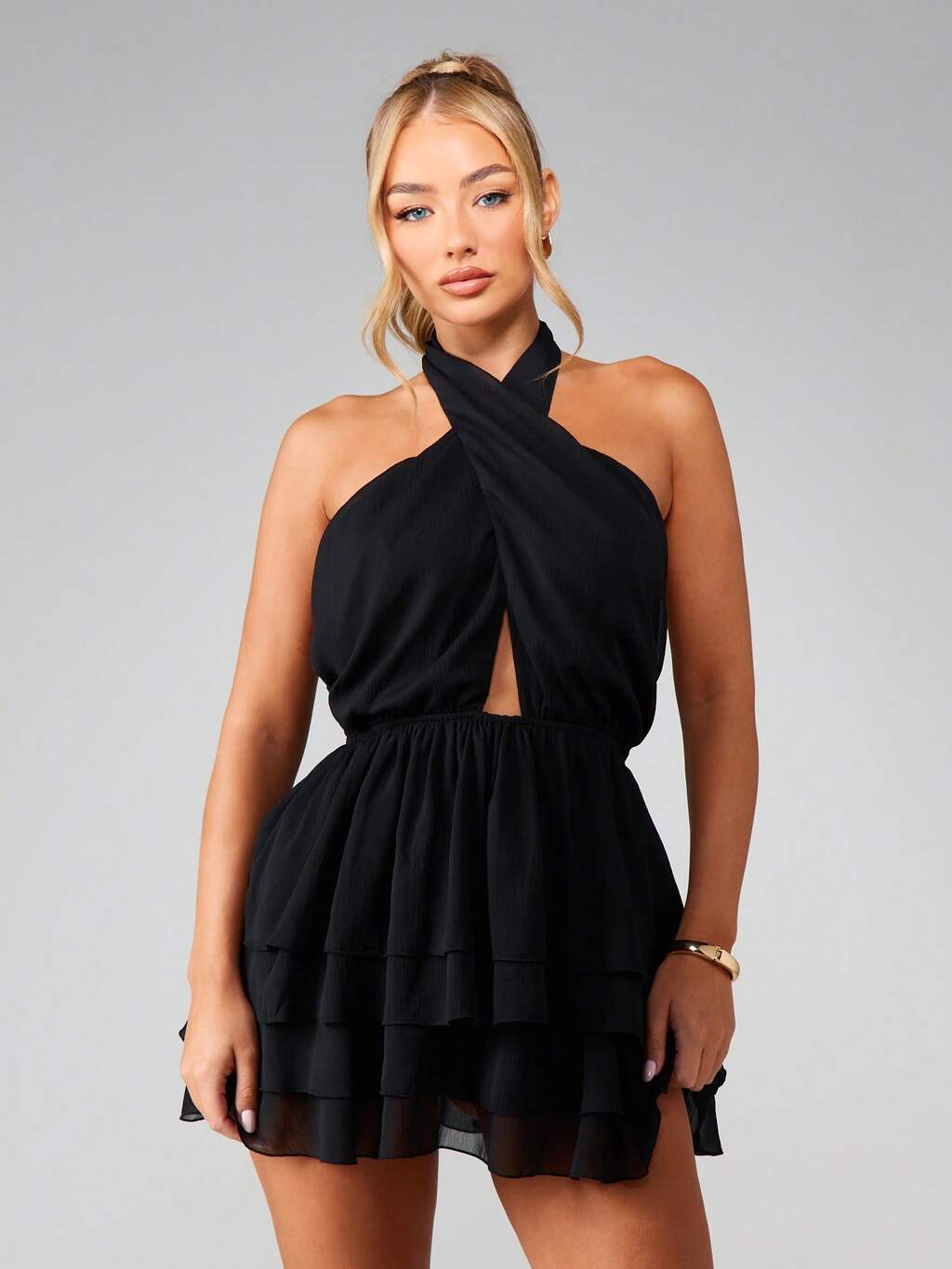 MISSGUIDED Vestido curto de chiffon com decote halter e saia com babados